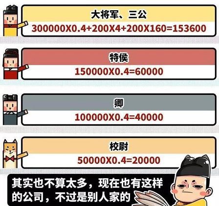 北宋时期属于高薪时代,官员的俸禄包括:钱(正俸),米(禄粟),职钱,公用钱,职田茶汤钱,差旅费,厨料,薪碳等,。宋代高官工资虽然很高,他们的"年终奖"却不多:宰相级别只有5只羊、5石面、两石米和两坛子黄酒(等于现在的几千块钱)。清朝的时候,皇帝一般用荷包赏赐大臣,寓意岁岁平安。蒙古亲王的大荷包里,一般装有各色玉石八宝一份,还有四对小荷包,里面装有金银八宝各一份,又有小荷包一个,里面也是装着钱。
