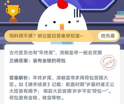 蚂蚁庄园年终奖正确答案是什么?古代官员也会有年终奖,那么皇帝一般会赏赐什么奖励呢?估摸着不少老铁们不知道正确答案,只知道现在年末老板们会给我们发年终奖,在古代的官员一样也是有年终奖的,是不是金银财宝这些呢,那么古代的年终奖到底是什么呢?一起来揭晓答案吧!