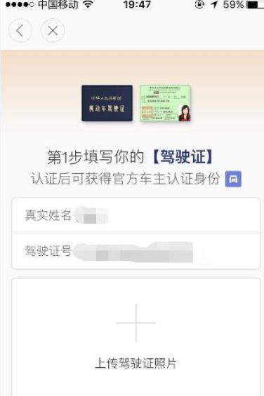 之后会进入注册车主的注册界面,首先我们输入自己的姓名跟驾驶证号,然后再在上传驾照证照片区域上传自己的驾驶证。需要注意的是上传的驾驶证必须清晰。