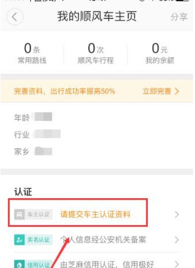 这时会弹出“我的顺风车主页”页面,在这里我们点击“认证”栏中的车主认证旁的“请提交车主认证资料”按键。