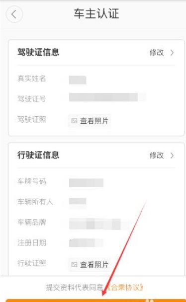 成功上传车辆的行驶证后我们点击“下一步”,这时会进入“车主认证”的信息确认页面,在这里我们复核下所填写的信息,无误后我们点击*下方的“提交”按键。