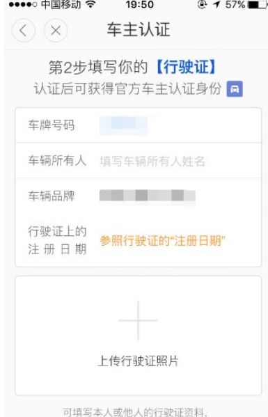成功上传驾驶证后,接着我们在新的页面输入自己汽车的车牌号码、车辆所有人、车辆的品牌以及行驶证的注册日期,然后在上传行驶证照片区域上传自己的行驶证。跟上传驾驶证一样所上传的行驶证也必须清晰。