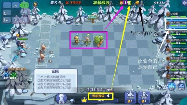黄框框:可以理解为基地等级,目前4本基地,可以上场的卡牌上线为4。黄框框右边的是花费5个金币升基地,只有4点经验,注意使用!